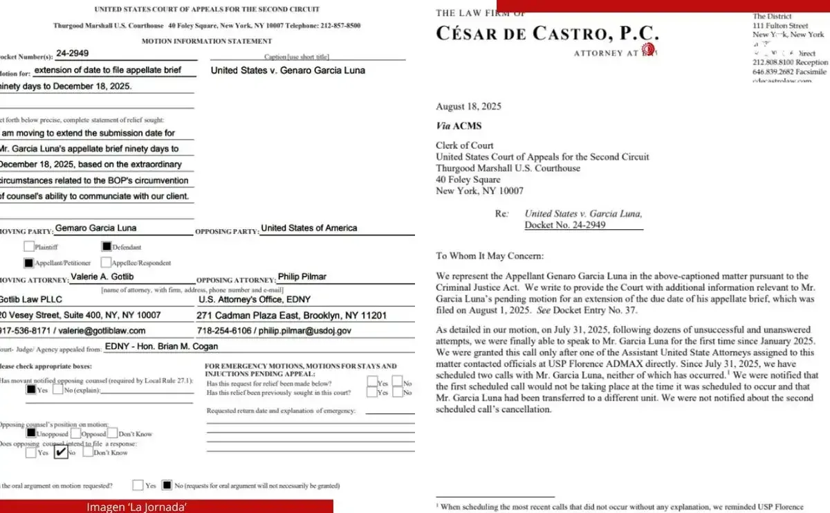 Ciudad de México. El ex Secretario de Seguridad Pública, Genaro García Luna, pidió a una Corte de Apelaciones de Nueva York una extensión de noventa días adicionales para presentar su escrito de apelación a su condena de 38 años de prisión que enfrenta por sus vínculos con el Cártel de Sinaloa, debido a que “ha sido muy difícil comunicarse con sus abogados”.