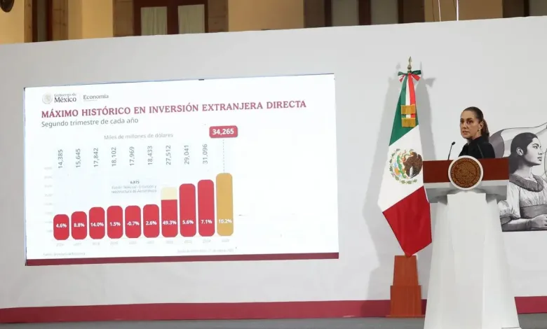 Ciudad de México. La presidenta Claudia Sheinbaum Pardo informó que México tiene un nuevo máximo histórico en inversión extranjera: 34 mil 265 millones de dólares en el segundo trimestre del año. “Ni los aranceles (estadunidenses) pudieron con la economía mexicana”, subrayó.